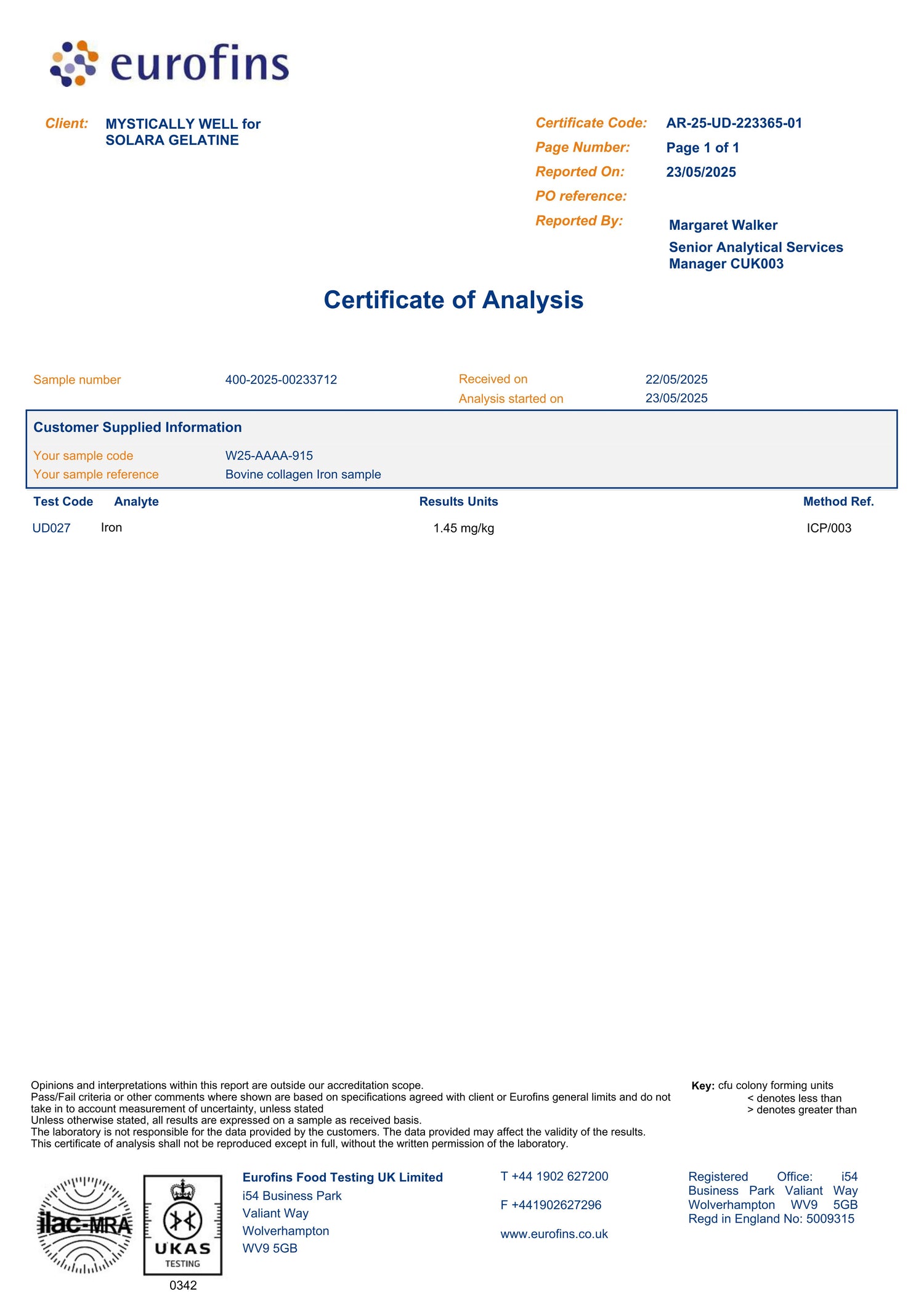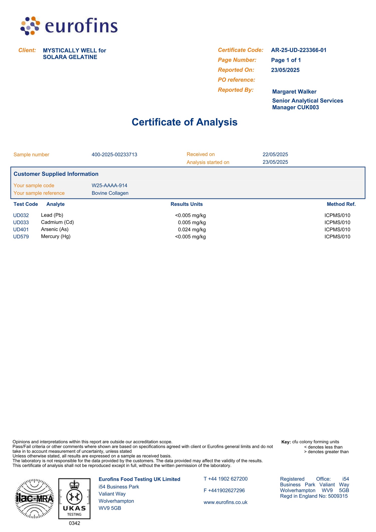 Our collagen is tested by Eurofins UK, one of the world’s most trusted labs, and the results are exceptional. With lead and mercury levels so low they’re barely detectable (<0.005 mg/kg), cadmium at just 0.005 mg/kg, and arsenic at a tiny 0.024 mg/kg, these figures are dramatically beneath international safety standards. This means our collagen is not only safe for everyday use — it’s remarkably pure, providing peace of mind alongside powerful benefits for your skin, gut, and joints.